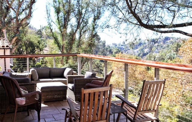 | The large deck at the back of the home affords tranquil views of the Hollywood Hills |